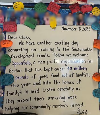 For the second year in a row, Liz Miller of Spoonfuls returned to Kelly Keefe’s 5th grade classroom at the Josiah Quincy Elementary School to discuss her work in relation to the United Nations’ Sustainable Development Goals.