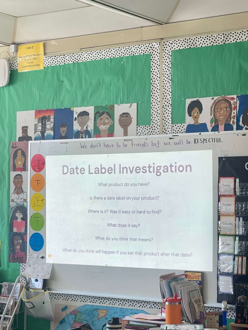 Liz also led the students through an activity where they examined “expiration” dates, questioning the confusing differences between “best buy,” “use by,” etc. So what should we do when we’re unsure if food is safe to eat? “Look, smell, taste, don’t waste” – use your senses to figure out whether a food is okay to eat, rather than blindly following the date on the package and risking unnecessary waste.